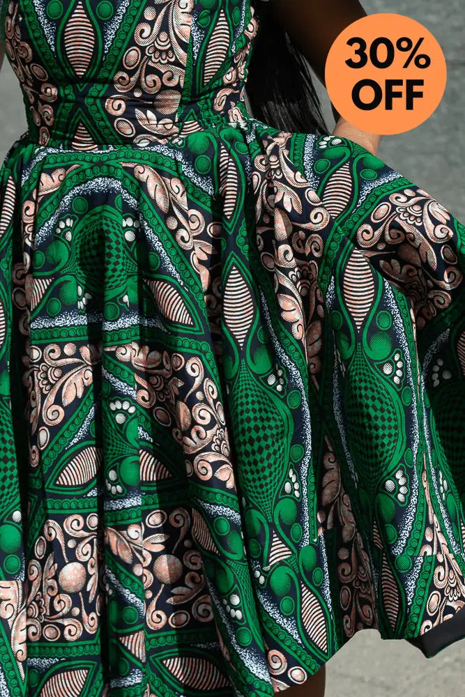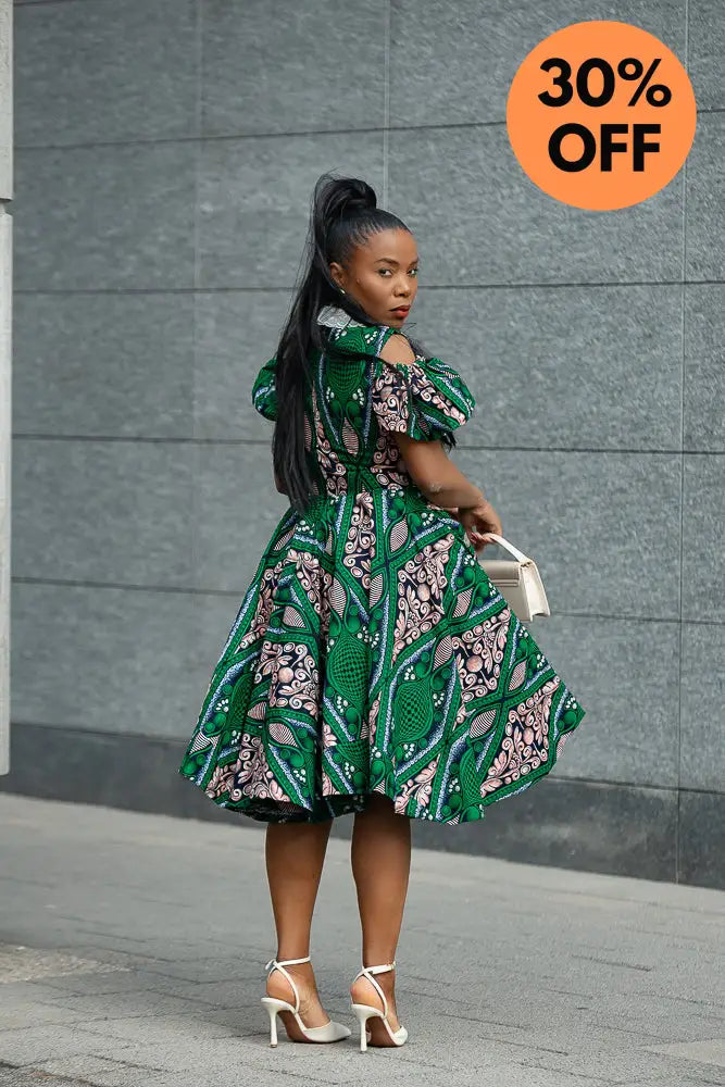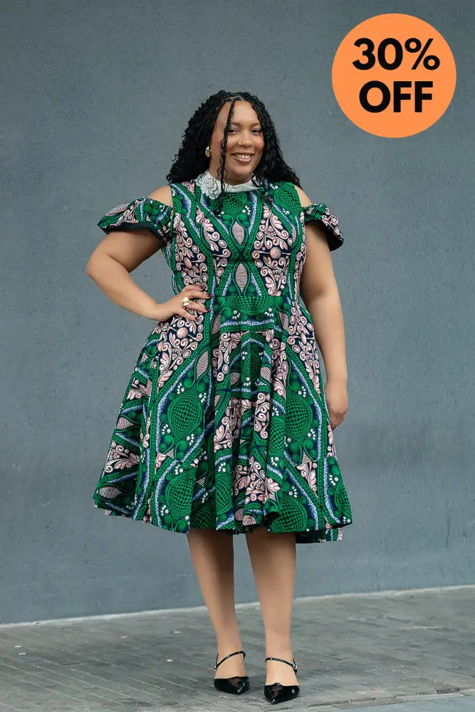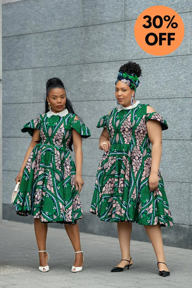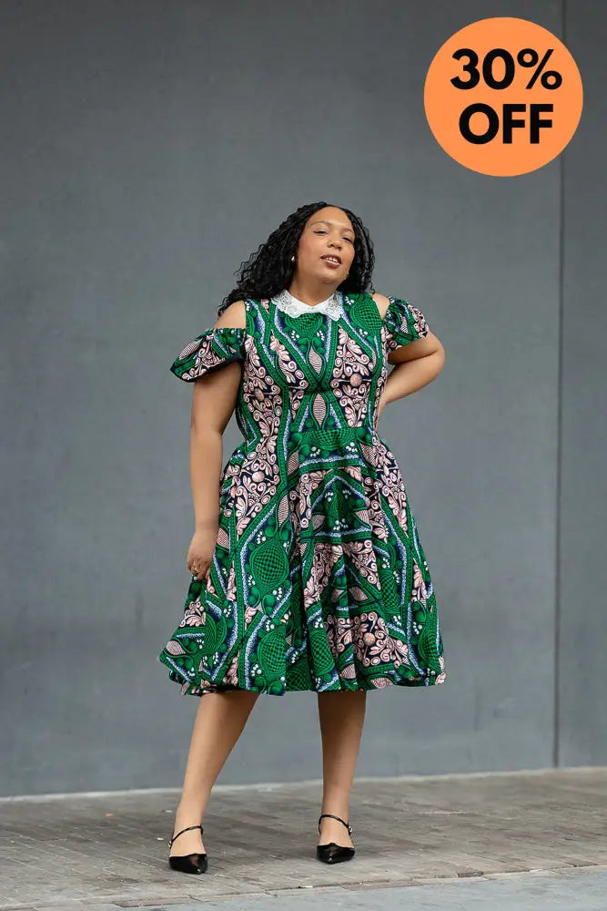Make room in your wardrobe for this showstopper. This fit-and-flare Ankara dress features bold green and pink print magic, with sweet shoulder cut-outs and a crisp white lace collar that adds just the right touch of vintage charm. It’s playful, powerful, and effortlessly pretty—with a twirl-friendly skirt that was made to move. Brunch date? Wedding guest? This dress is your “I’ve arrived” moment.