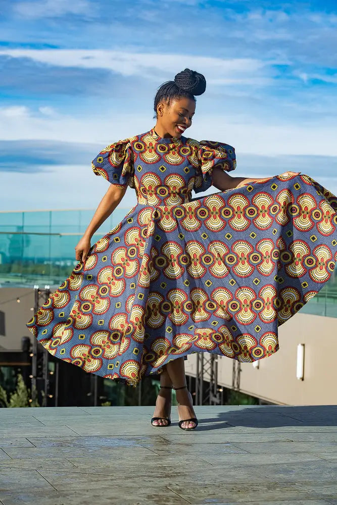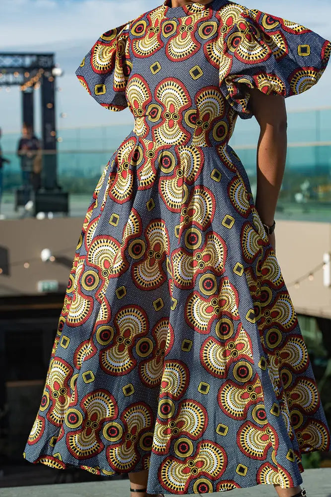 Feminine design meets trending style. The OLORI High Neck Dress is the piece your wardrobe's been waiting for. A classic high-neck dress with puffy arms for a contemporary twist. It’s a light easy wear, with outstanding prints, side pockets and a back zip for convenience.